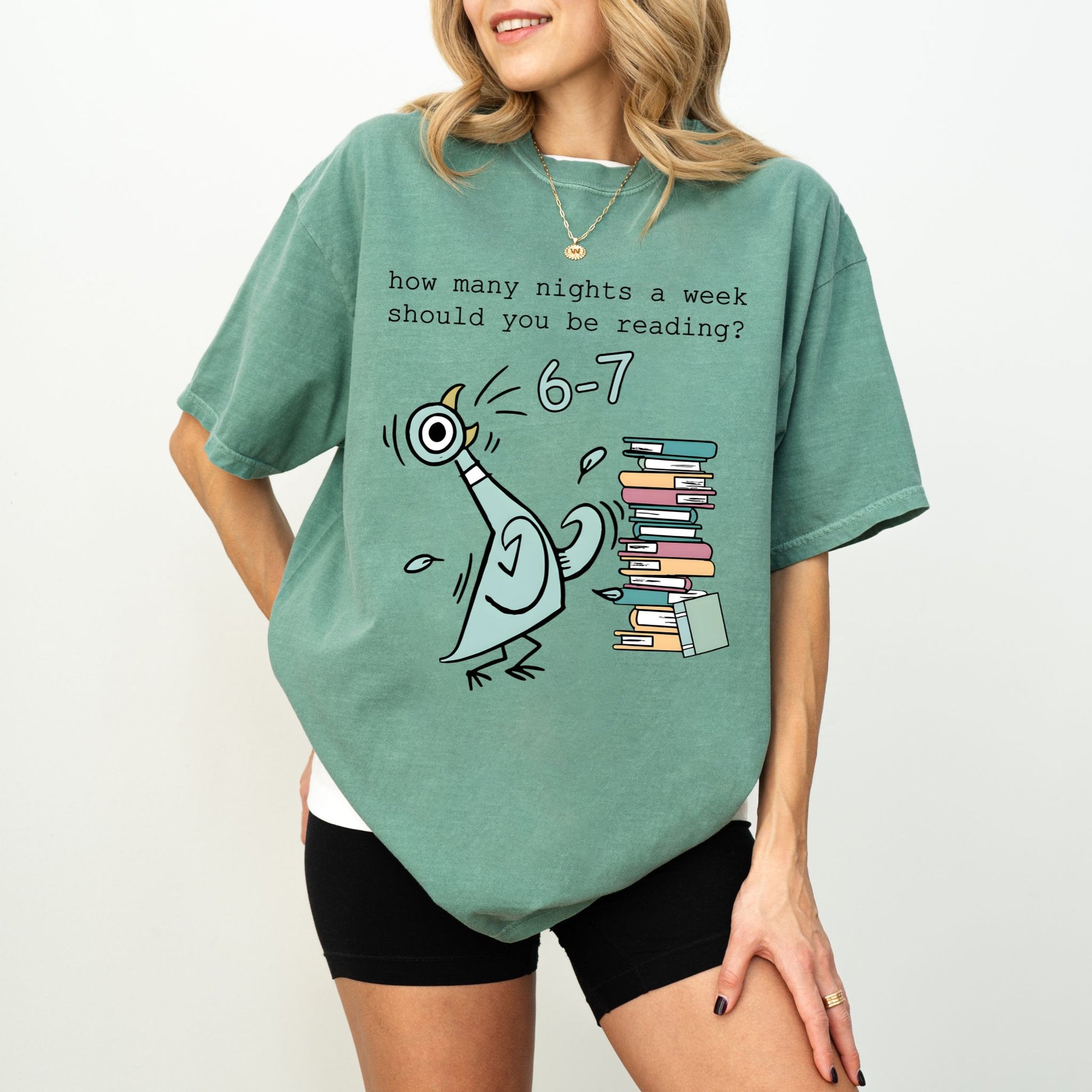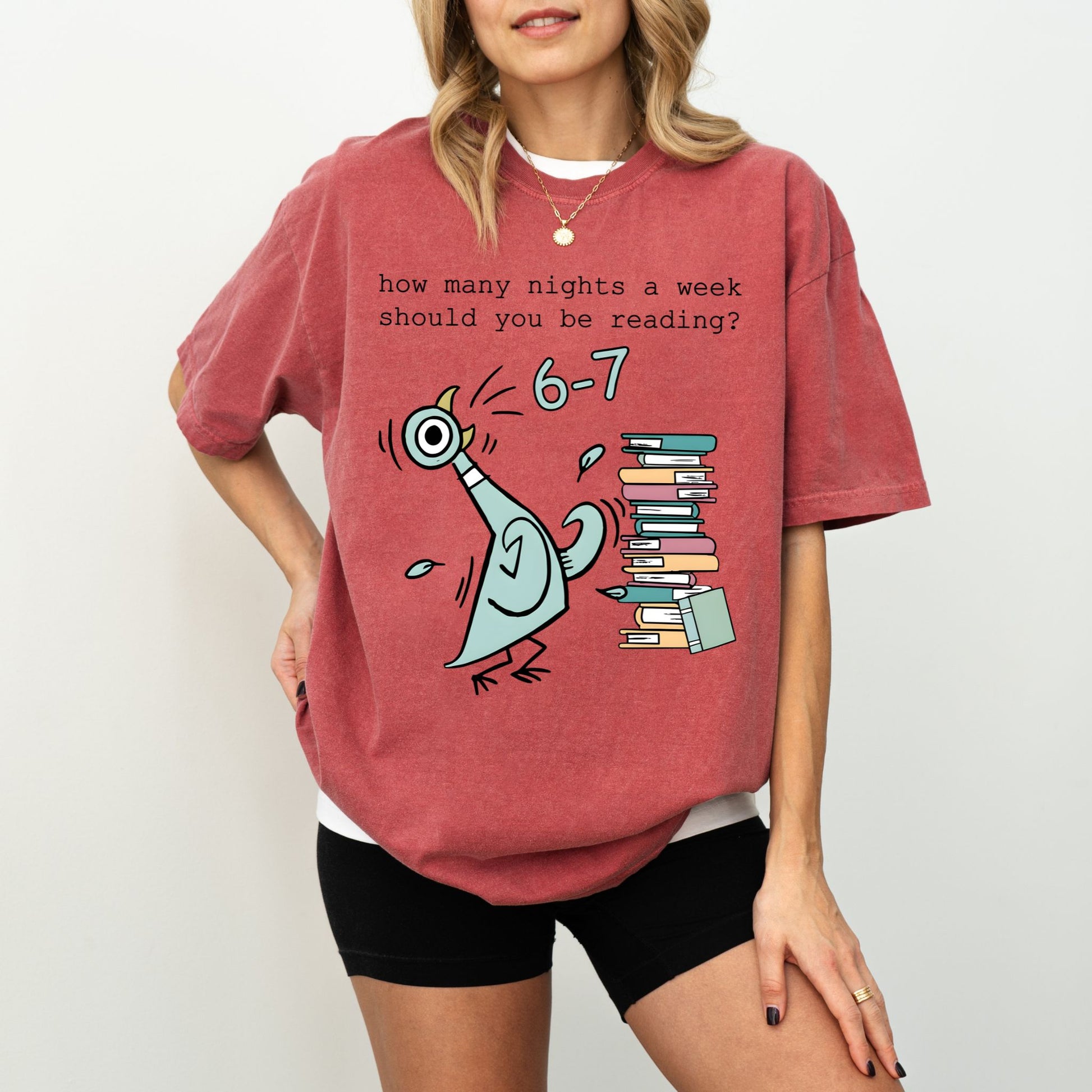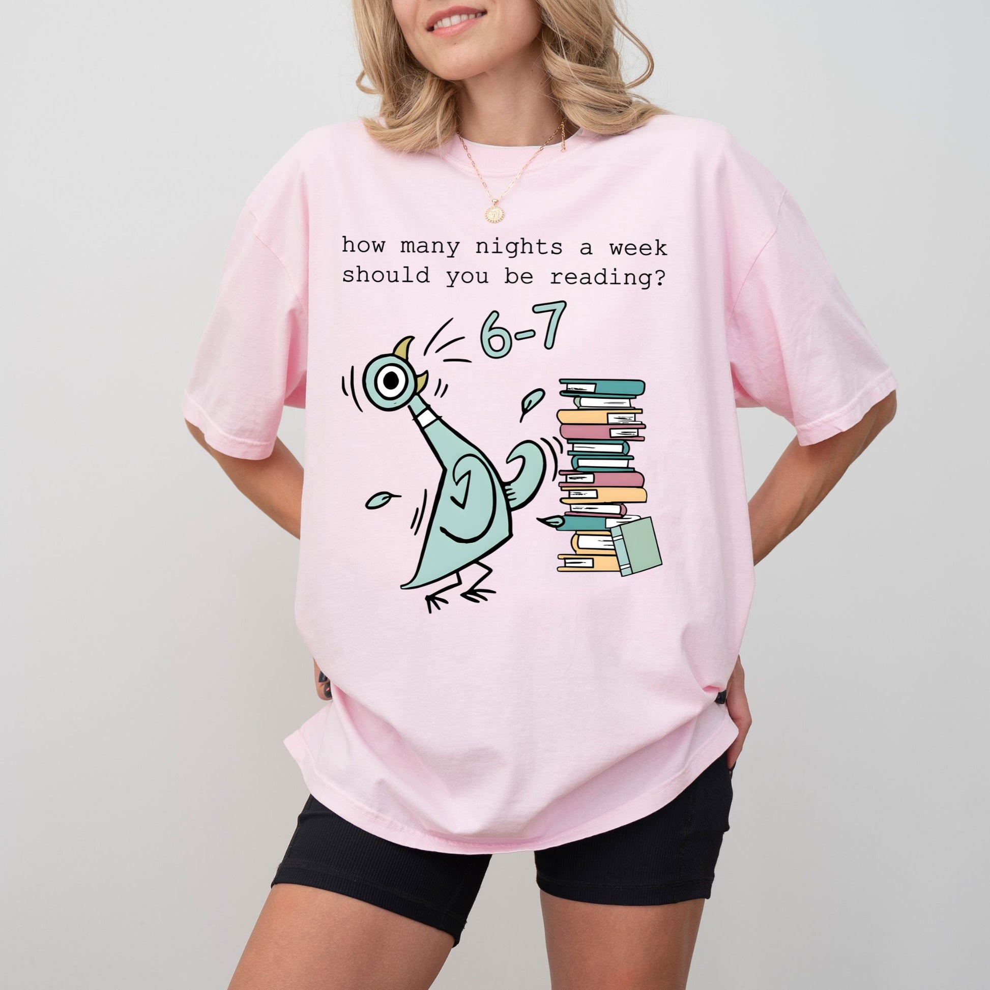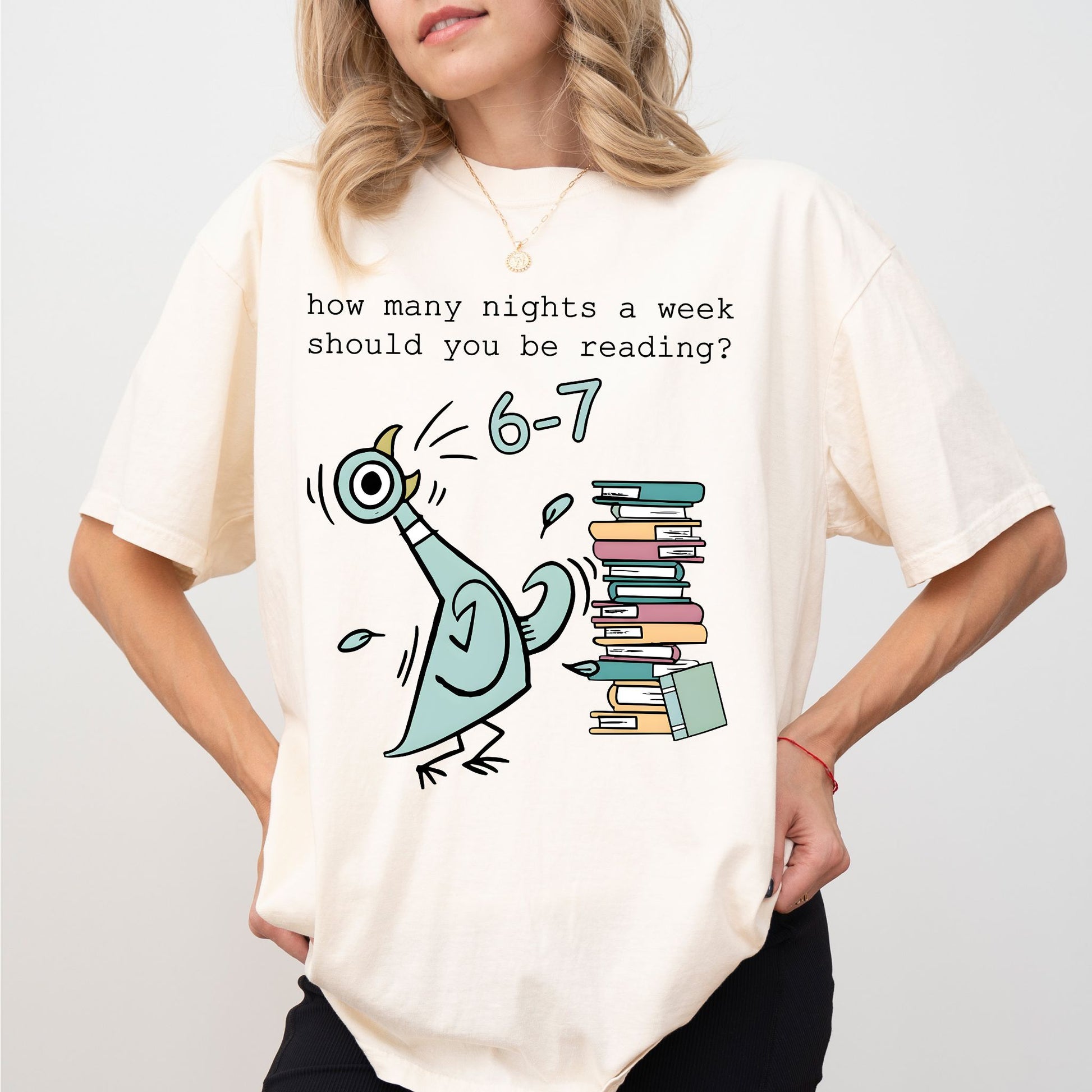 Printed on premium Comfort Colors®, this tee feels soft, lived-in, and perfectly cozy—just like your favorite reading nook. The playful “How many nights a week should you be reading? 6–7” graphic captures the humor every book lover understands.