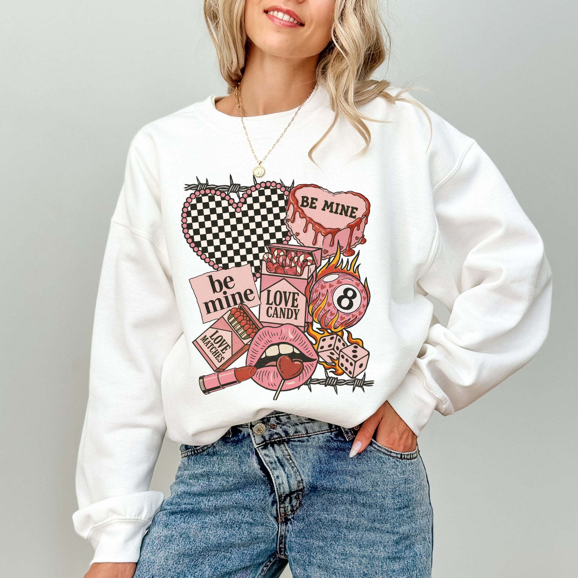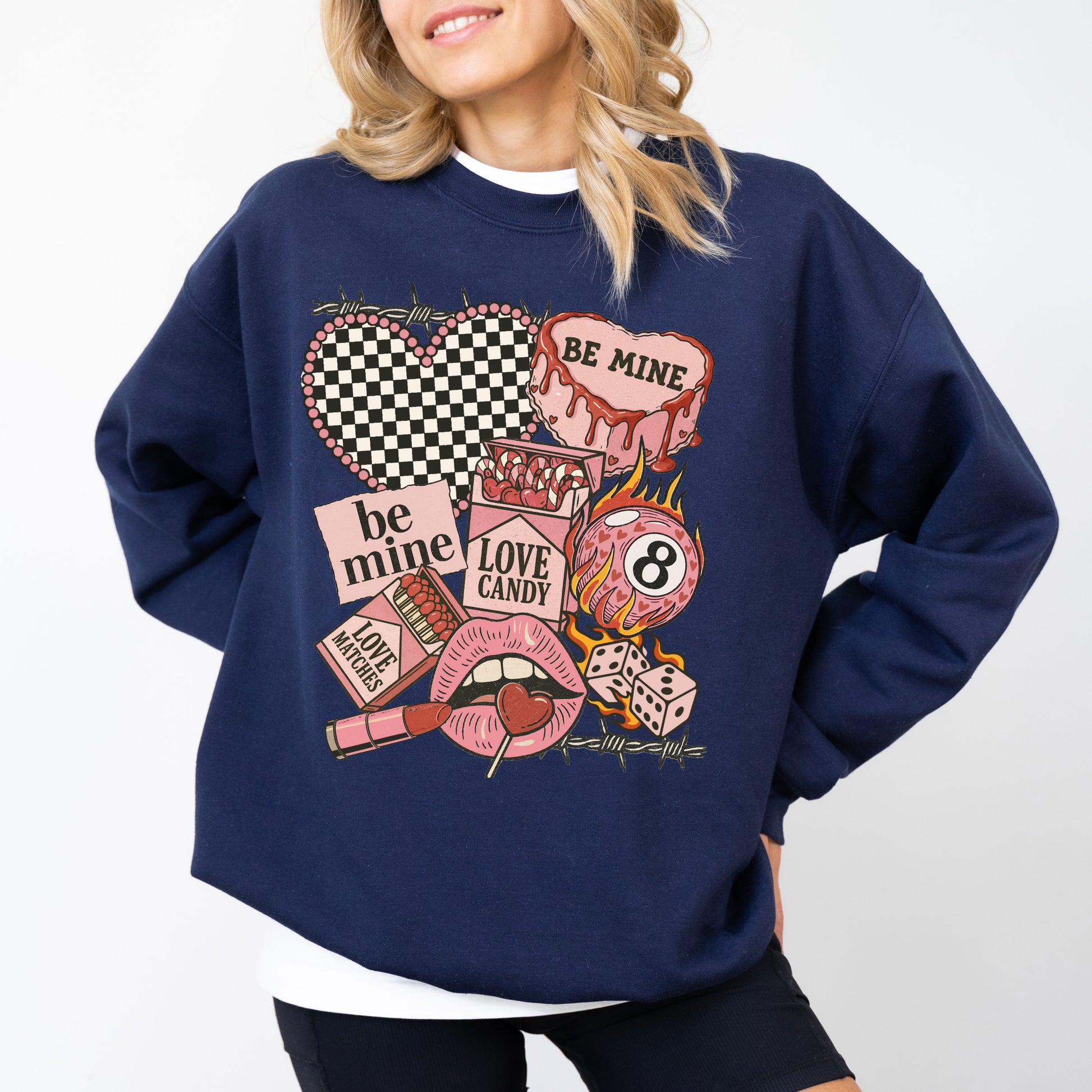 "Be Mine" Edgy Retro Valentine's Sweatshirt, Checkered Heart & 8-Ball Graphic Crewneck