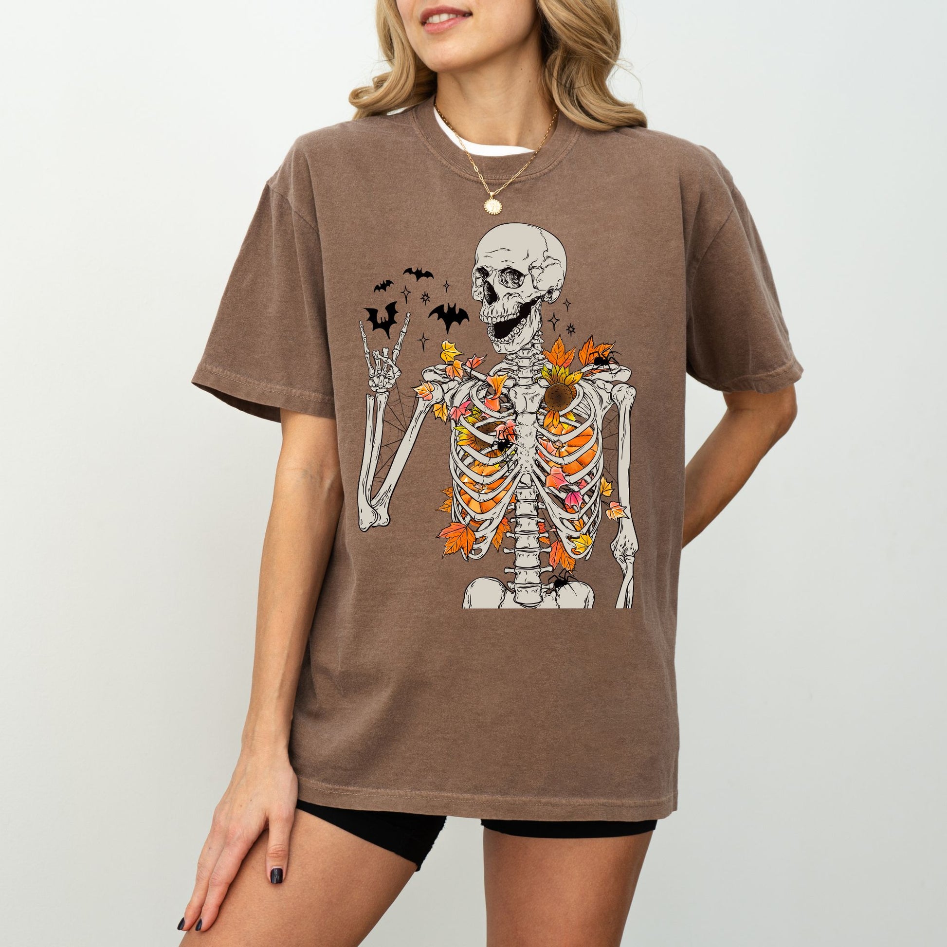 This Fall Skeleton tee features a detailed skeleton graphic filled with autumn leaves, sunflowers, and spooky bats—turning a creepy classic into cozy seasonal style. Perfect for anyone who loves mixing Halloween energy with warm autumn vibes.