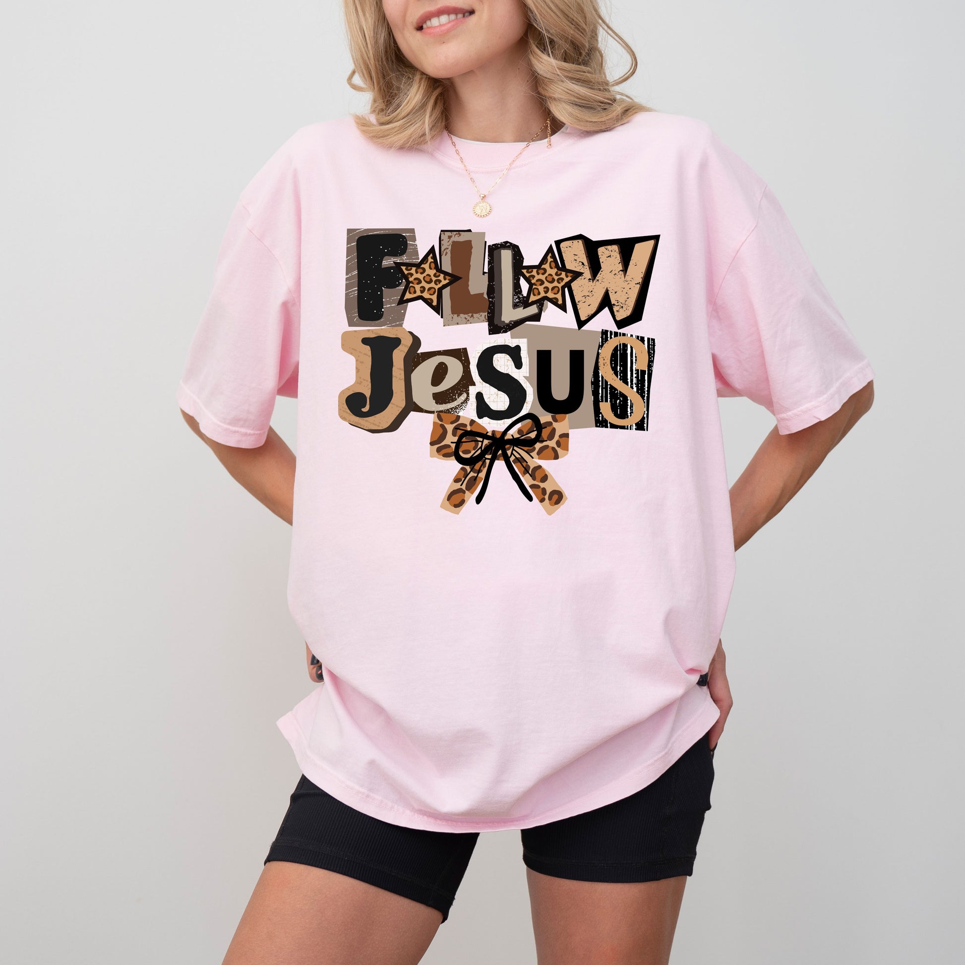 The Follow Jesus Leopard Graphic T-Shirt combines bold faith with modern style. Featuring mixed typography, leopard accents, and a bow detail, this design delivers a confident yet approachable Christian message that stands out without being loud.