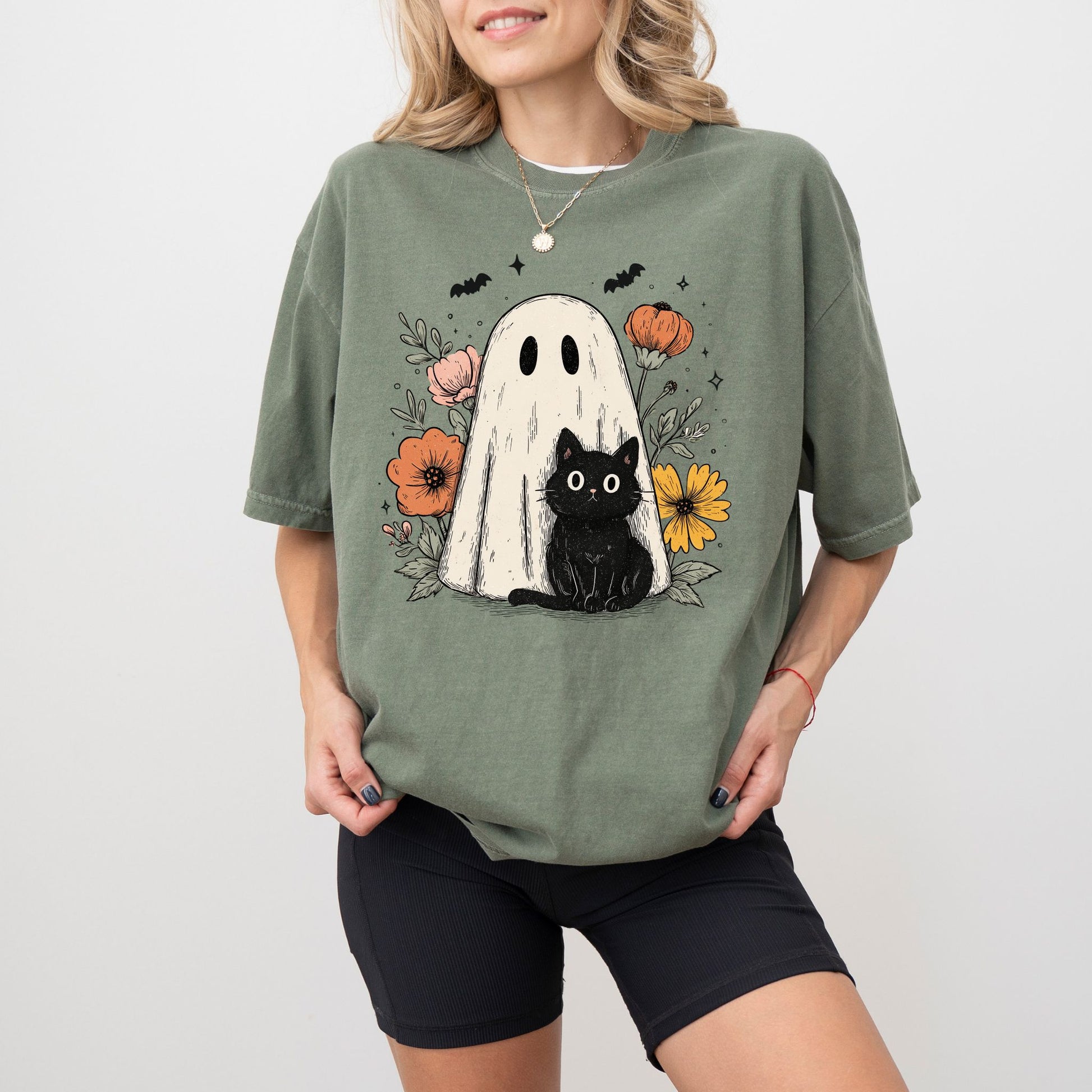Ghost & Black Cat T-Shirt – Spooky Cute Floral Graphic on Comfort Colors® Tee