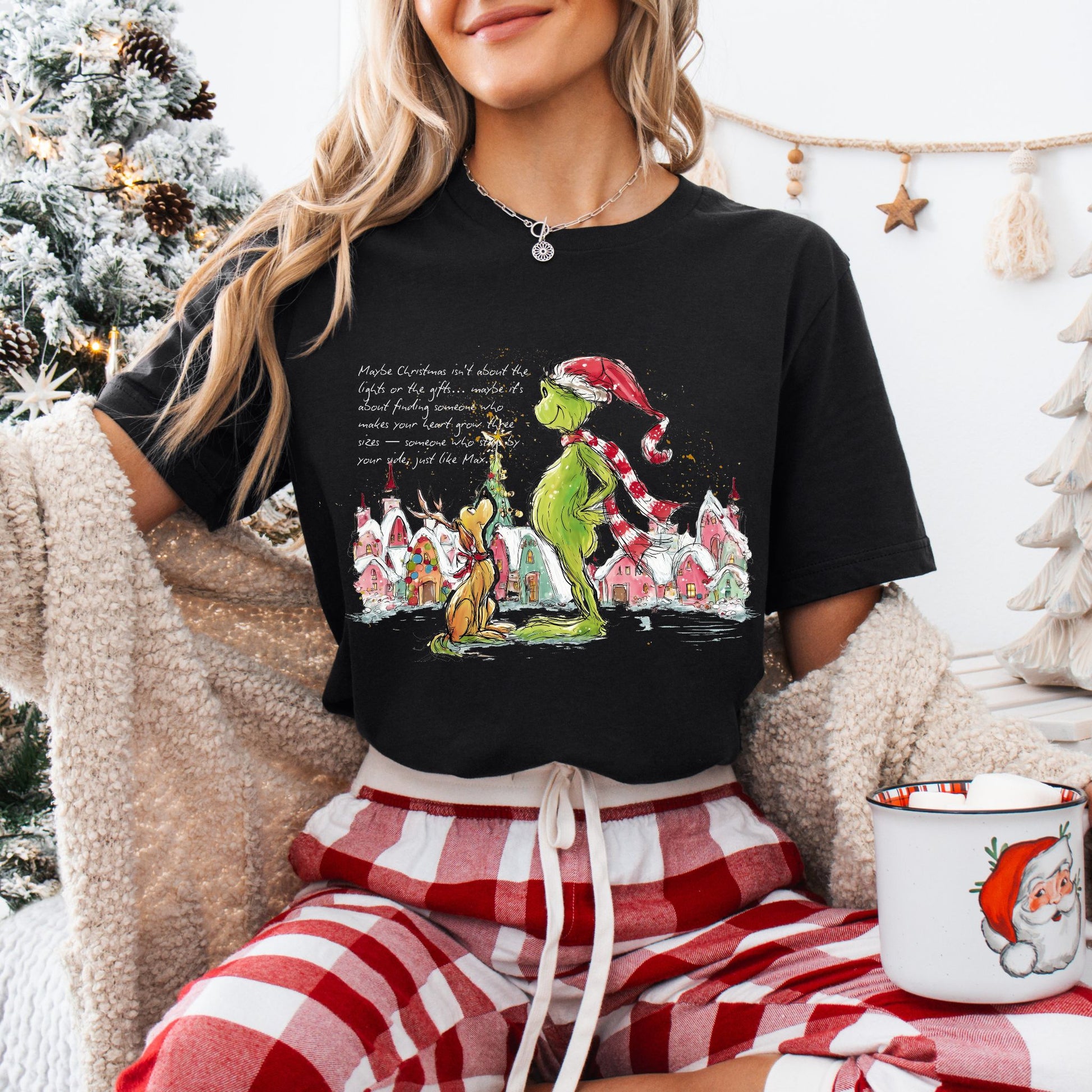 Featuring a cozy watercolor illustration of the Grinch and Max surrounded by a snowy village, this tee captures the heart of the season: warmth, love, and meaningful moments.
