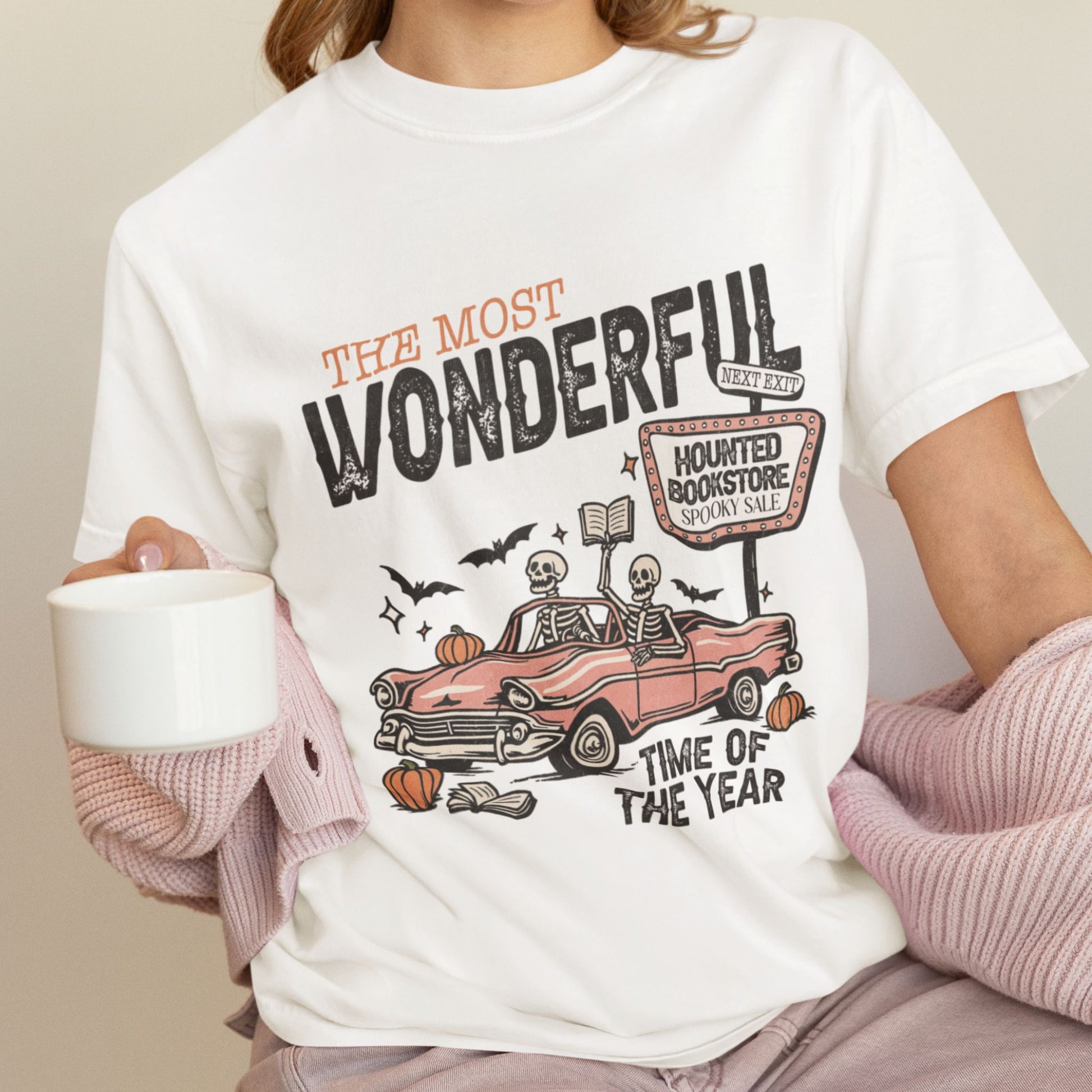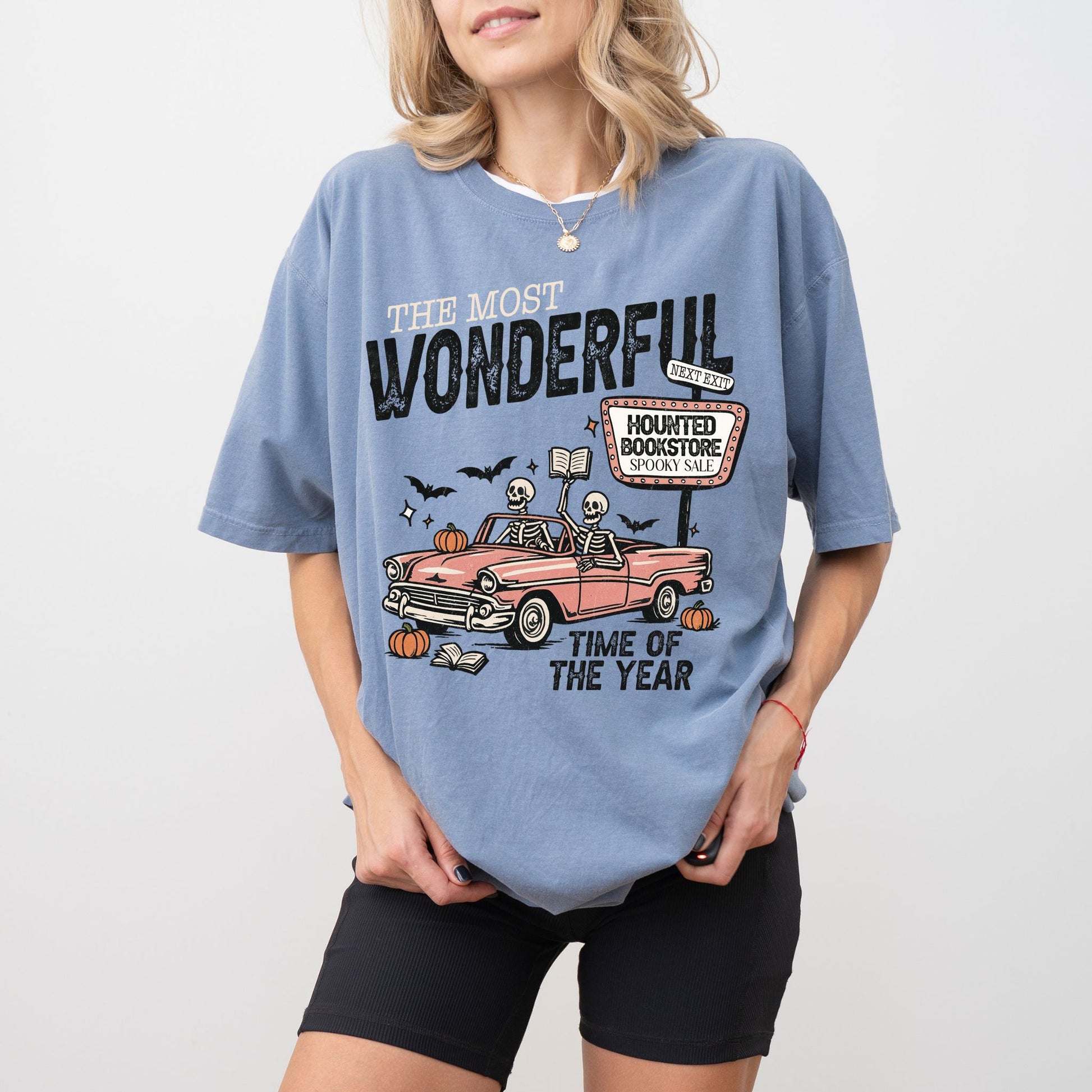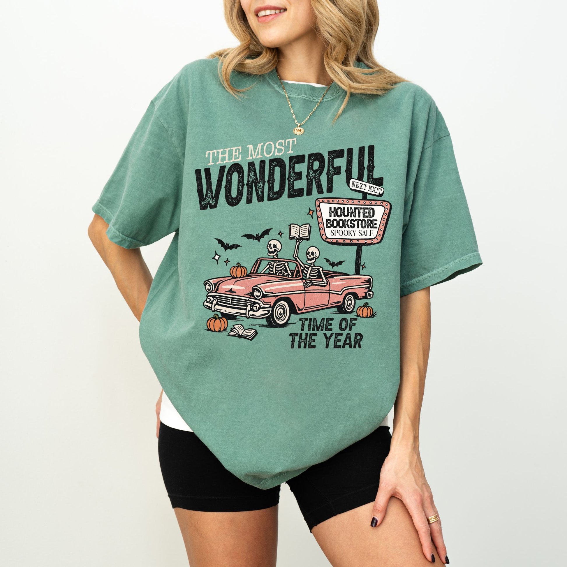 Cruise into spooky season with our Haunted Bookstore Skeleton Tee—printed on authentic Comfort Colors® for that soft-washed, lived-in feel. Two book-loving skeletons roll past a neon sign in a vintage car, mixing cozy nostalgia with Halloween charm.