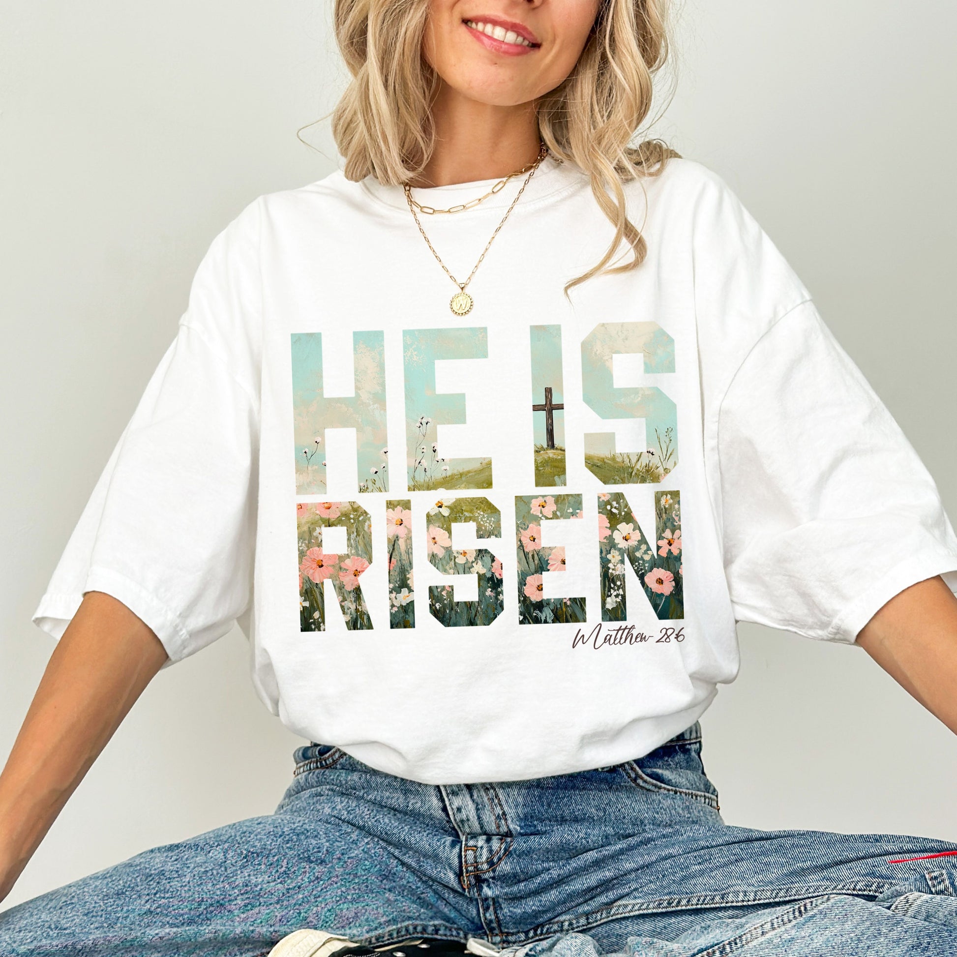 This Christian Easter t-shirt features the powerful message “He Is Risen” inspired by Matthew 28:6, paired with a peaceful spring landscape and cross artwork. Soft floral details and calming colors create a beautiful reminder of faith, hope, and renewal.