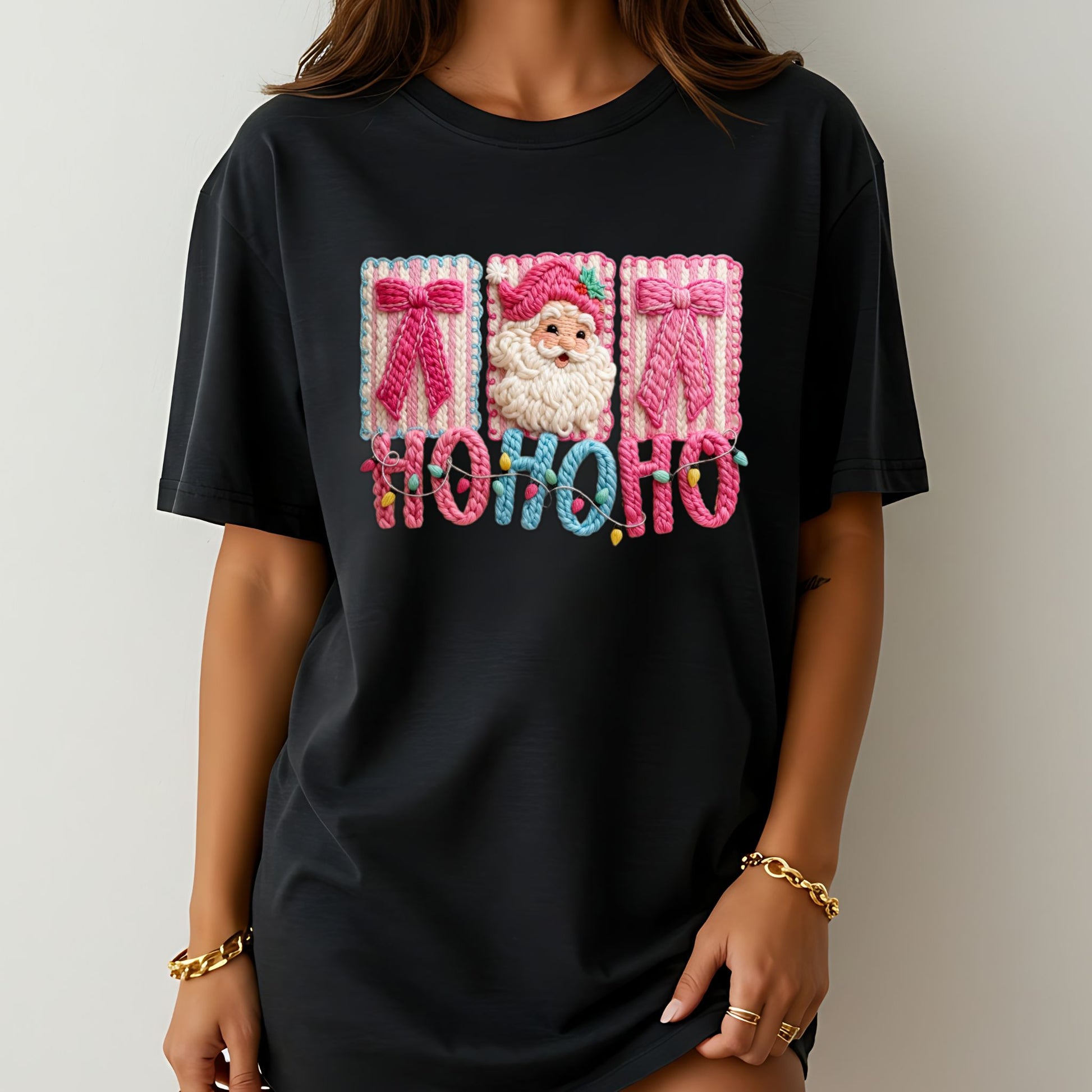 Printed on premium Comfort Colors® for that soft-washed, lived-in feel everyone loves, this tee features a faux-yarn style Santa with festive pink bows — cozy, colorful, and perfect for the season.