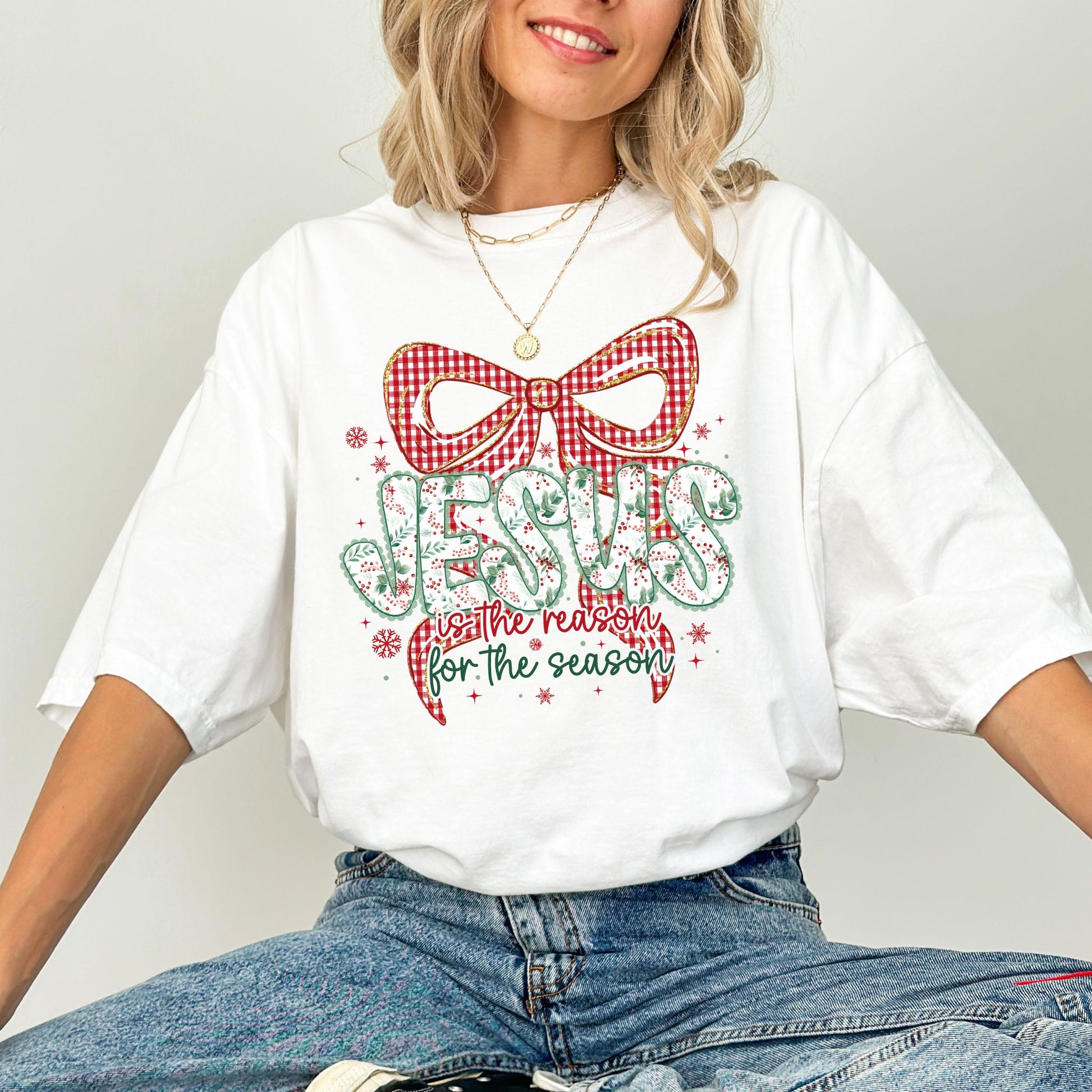 Our “Jesus Is the Reason for the Season” Comfort Colors® tee brings that message to life in the coziest way. Designed with a festive gingham bow and soft pastel holiday tones, this shirt feels like a warm reminder of faith and love through every celebration.