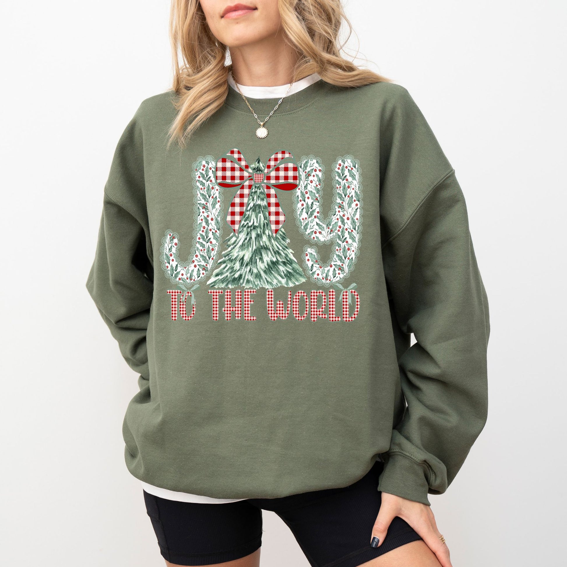 Joy To The World Christmas Sweatshirt | Vintage Plaid Bow & Tree Holiday Crewneck