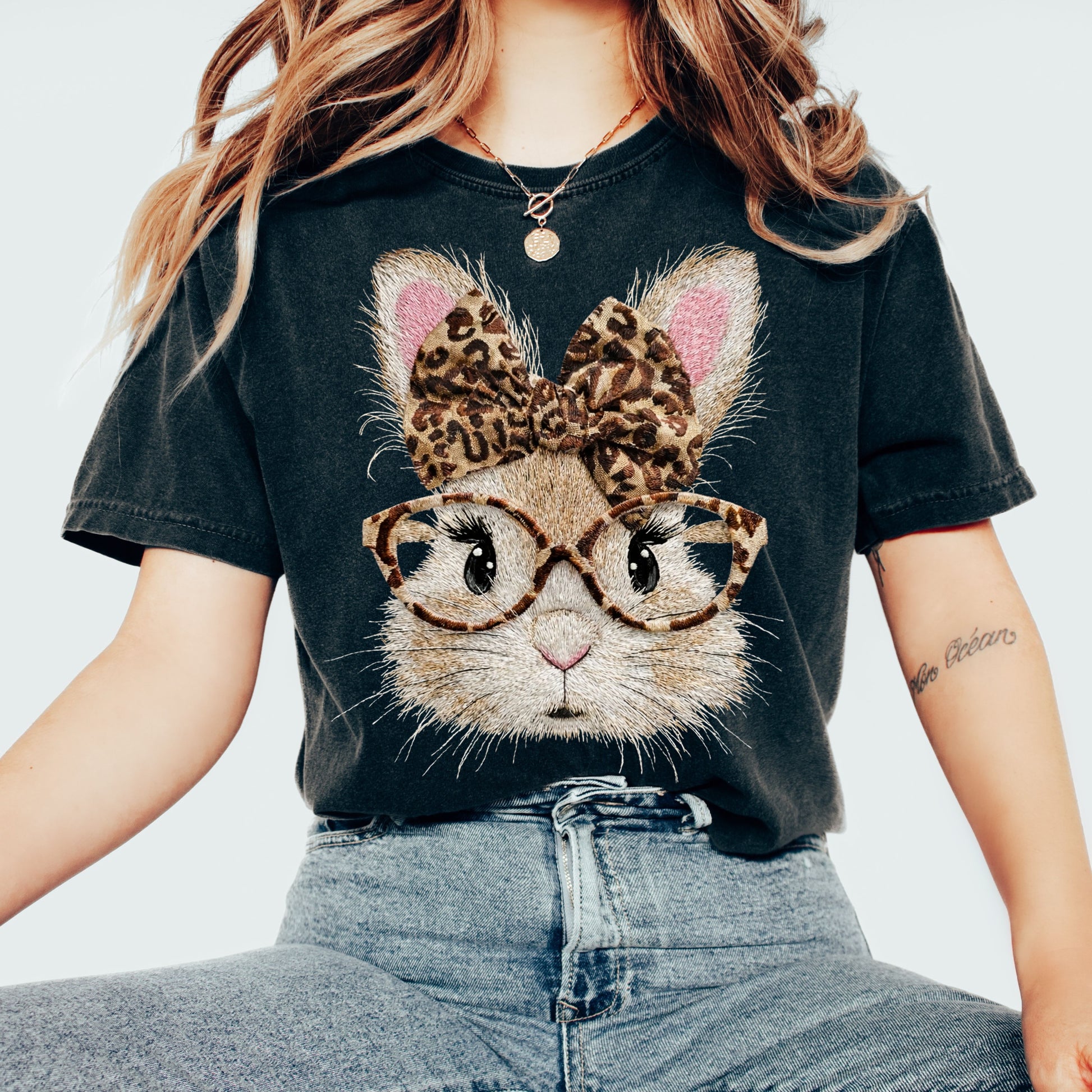 This adorable bunny graphic tee blends cozy charm with boutique-style flair. Featuring a fluffy rabbit wearing oversized glasses and a leopard print bow, it delivers the perfect mix of cute, playful, and fashion-forward.