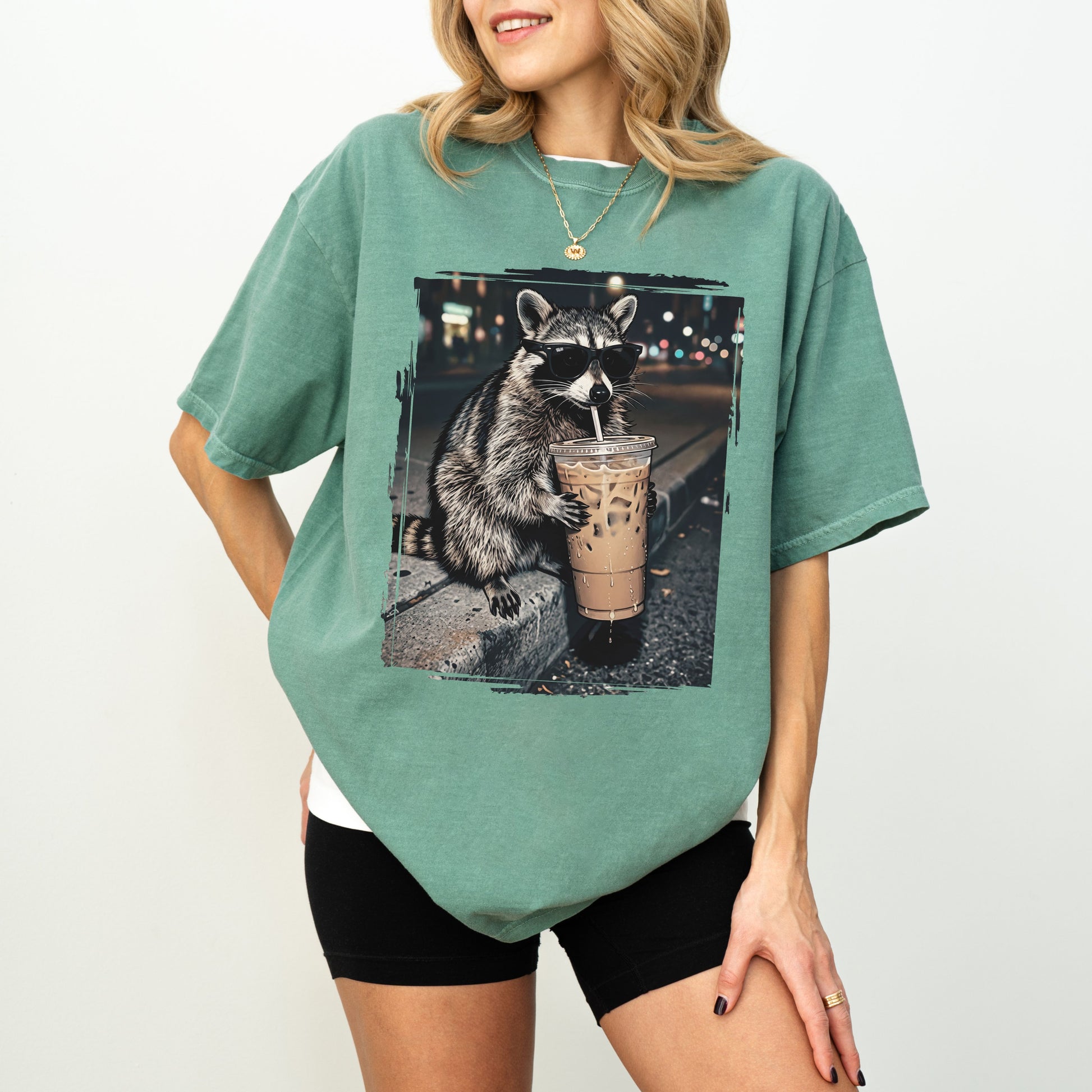 This adorable raccoon graphic tee perfectly captures that “running on caffeine and vibes” energy. Featuring a cool raccoon rocking sunglasses and clutching an oversized iced coffee, it’s playful, relatable, and impossible not to smile at.